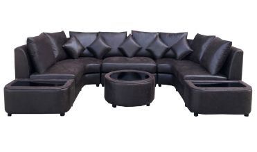 طقم كنب لغرفة المعيشة من الجلد على شكل حرف U ، موديل معتدل ، بني غامق
