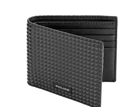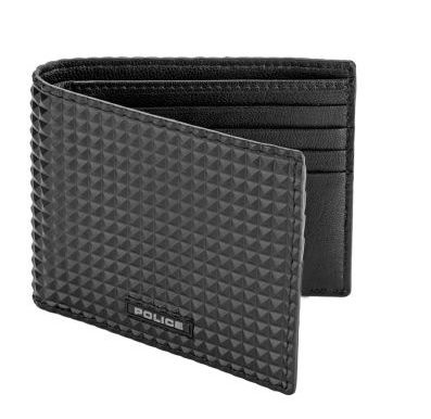 Police pyramid black wallet features stylish textured front, coin pocket and card slots.