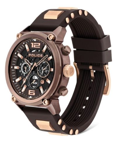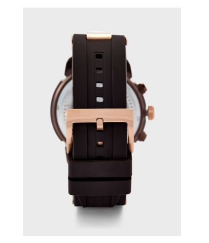 Durable Brown silicone wrist straps with metal panels Dial Colour: Brown Round dial with hour and minute markers Triple arm movement with chronograph functions 50 meters water resistant Adjustable pin buckle closure with dual keepers Comes packed in a branded box