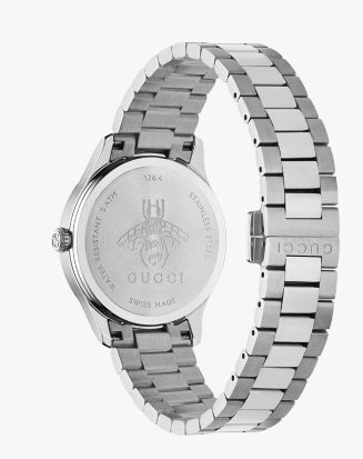 The Gucci bee, a historical symbol from the '70s archives, is combined with a sun brushed dial and steel bracelet. The G-Timeless collection combines classic design details with a contemporary aesthetic to create elevated watches with a timeless feel.