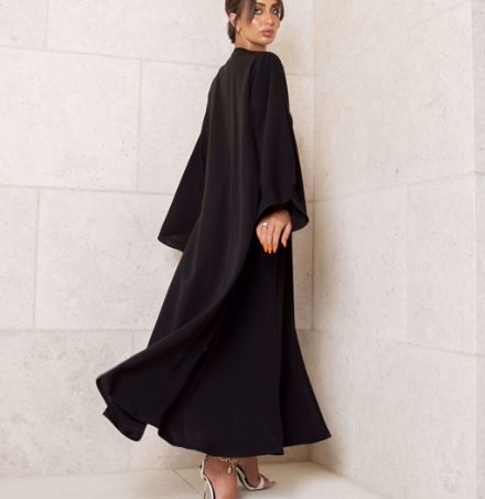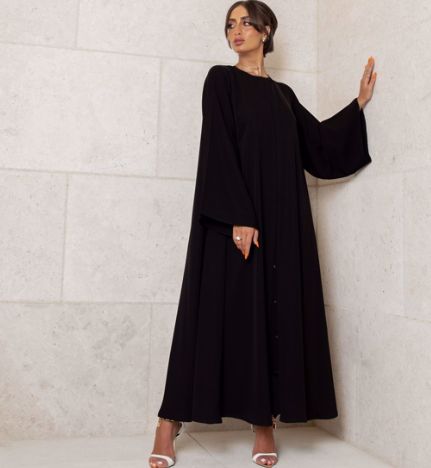 Plain double-cloche abaya, round neck, wide sleeves, with special details for our customers, the fabric is crepe internet (Free with the abaya, a black veil of the finest and finest types of Japanese chiffon)