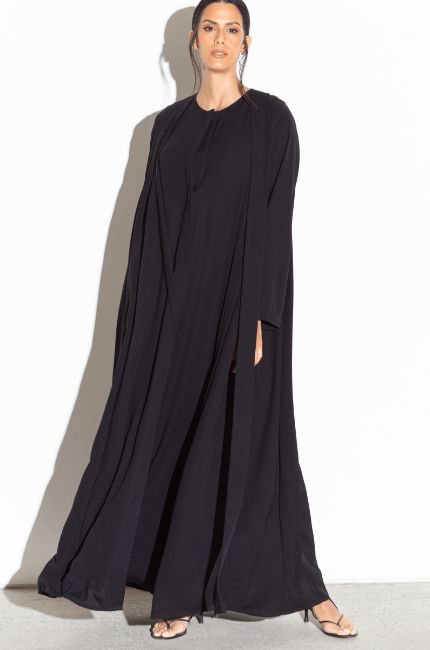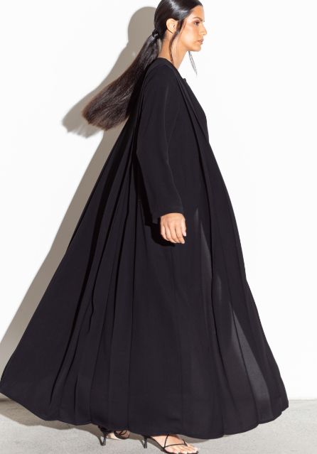 عباية مطوية باللون الأسود • إغلاق مغناطيسي • يأتي مع غطاء للرأس لون أسود كريب ياباني صنع في دبي طول العارضة 178 سم ومقاس المملكة المتحدة 10 و 58 بوصة