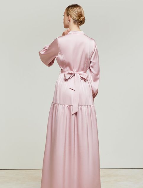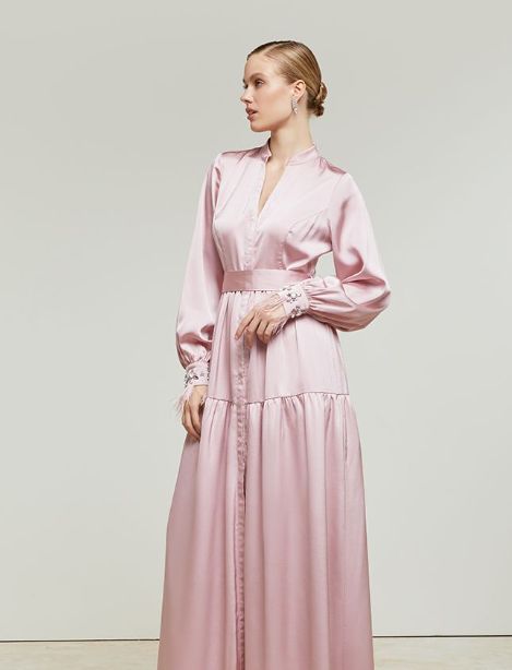 This style is with midi puff sleeves. Features feather-embellished cuffs designed with a self-tie belt at the waist