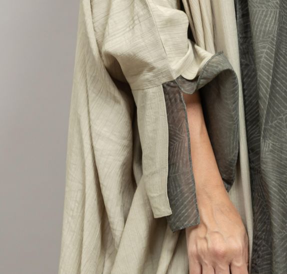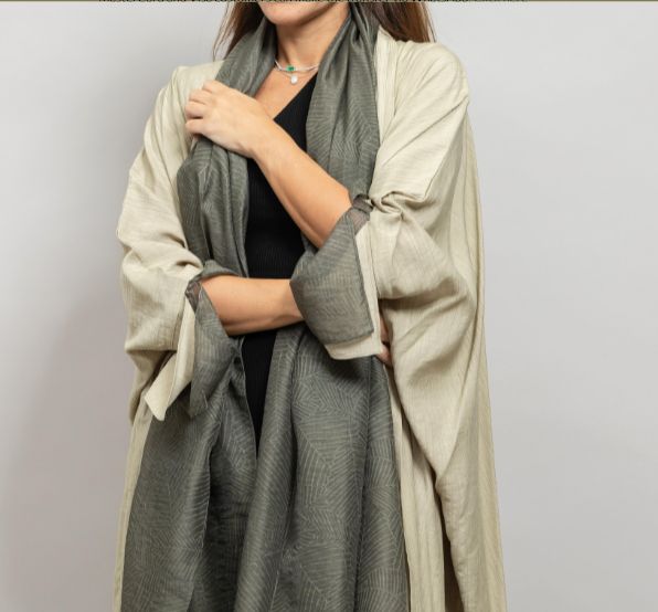 Amore Crepe Silk Bisht Abaya Stunning formal wear abaya made with crinkle crepe silk. Amore is a Bisht cut abaya with detailed sleeves lined with self print fabric with a contrasting scarf.