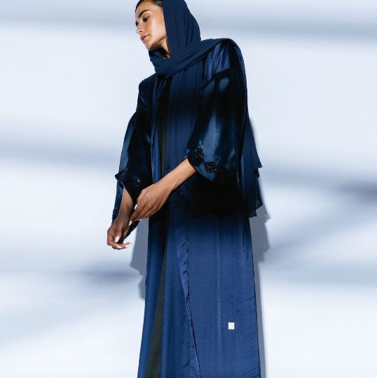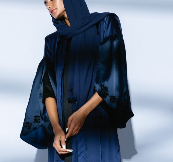 "Ta' Marbota" inspired the design of this cloak (abaya) set from the dark blue night sky and presented it with black hand embroidery on organza sleeves, in addition to being made of high-quality navy silk fabric, with a timeless design. Comes with navy blue silk veil embroidered on one side, stitched with black edges..