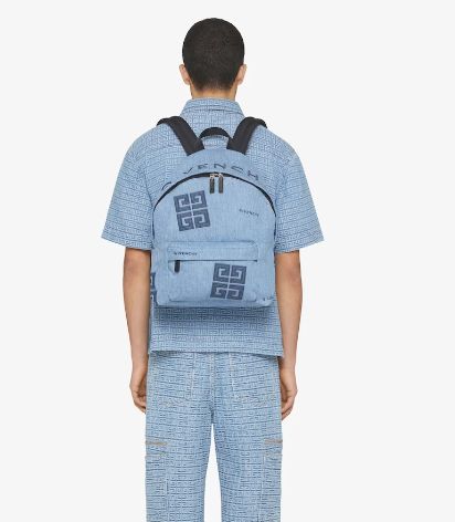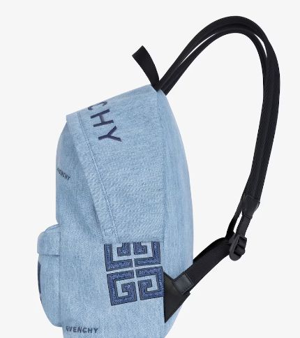 Backpack in denim with embroidered GIVENCHY signatures and giant 4G emblems on the front and top. Essential U line. Zipper closure with double leather zipper pull. Comfortable adjustable padded straps. One zippered pocket with embroidered GIVENCHY signature on the front. One flat pocket inside.