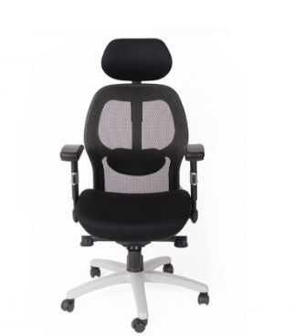Mesh back chair and fabric seat. It is available with a headrest and without a headrest. The hands are movable. The base is aluminum with movable wheels. It is available with a fixed base. The back of the chair moves in several positions.