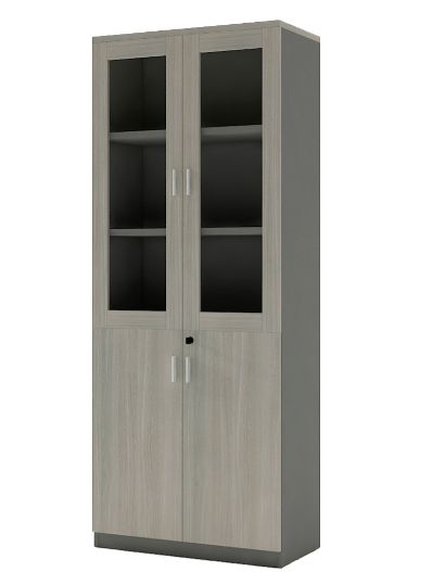Bookcase with two doors divided into two parts, the upper part with two storage shelves, part of it with a glass door, and the lower part with one shelf. Enables you to store books and arrange them better.