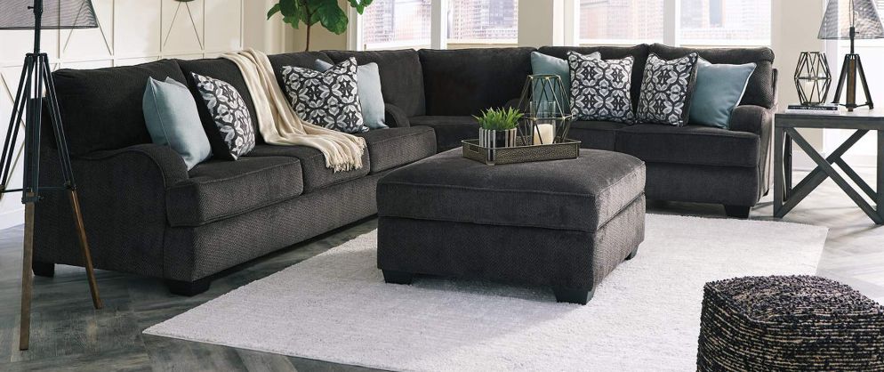 Wrapped in sumptuous charcoal fabric, it's so easy to fall in love with this plush Charenton sofa—with rolling arms for discerning flair. Adding to the feel-good experience: four cushions add tone, texture, and comfort to the scene. Couch Closed corner frame Attached and loose fit seat cushions High resilience foam cushions wrapped with thick poly fiber 2 pillows included Pillows with soft filling Polyester upholstery and pillows Exposed feet with faux wood finish The platform foundation system resists sag 3 times better than a spring system after 20,000 test cycles by providing more even support. Smooth foundation maintains a firm, crease-free appearance without the sagging or sagging that can occur over time with zigzag spring foundations.