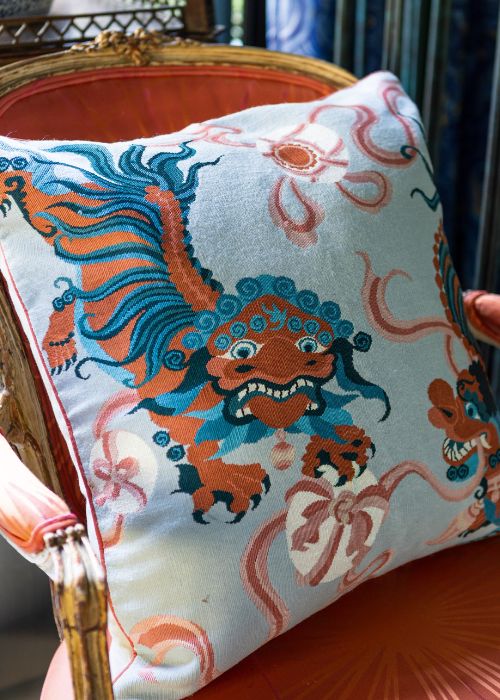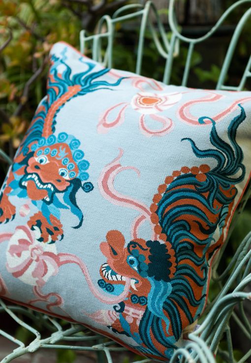 This pillow features two lions suspended in motion while chasing a globe, inspired by the ancient Chinese figure symbolizing wisdom and good luck. The Lion Dance is handwoven from silk threads on a fine wool background using Aubusson tapestry. Measurements: 22" x 22" / 56 x 56 cm Craftsmanship: Handwoven wool and Aubusson silk