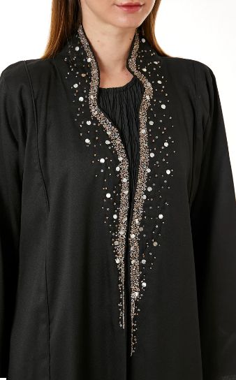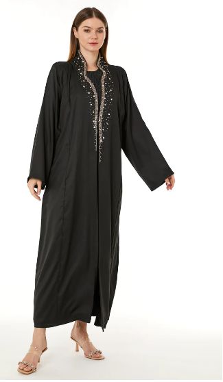 Black abaya made of Indonesian crepe fabric with a beautiful neck design and exquisite hand embroidery. If you love to be the most elegant in the room, then this abaya is the best choice for you. Available in all sizes. Comes with a matching scarf. Order your designer abaya now.