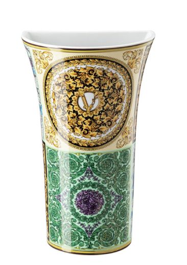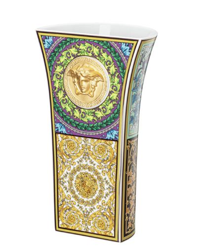 Decorated with signature designs of gold, purple, green, and blue, this gorgeous Versace "Barocco Mosaic" Vase etched with the Versace logo is a tableware gift staple for special occasions.