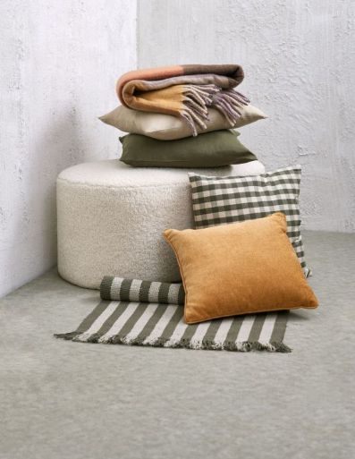 Indoor use 30°C mild wash Clinic Wash birds with similar colors, Bleach Do not bleach Tumble Dry Do not tumble dry Ironing do it non-iron Dry Clean Do not dry clean Size: Width: 60 cm, Length: 90 cm Gross weight front and back 1000g/m². Coloring method is yarn dyed Some are manual The color is beige, green Appearance color and texture may vary plaid design The shape is rectangular Environmental and Health Standard 100 certified by OEKO-TEX®