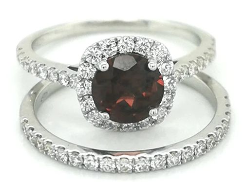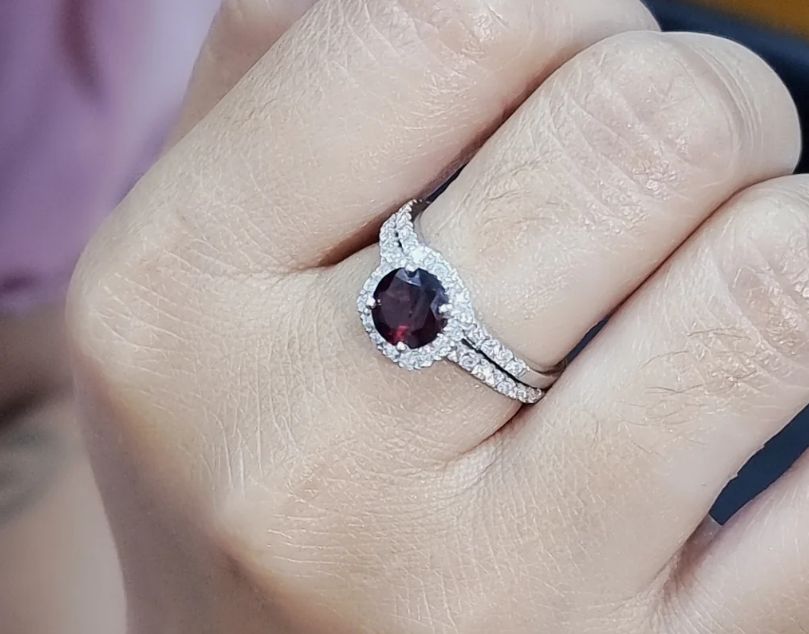 The rich red color of this gorgeous gemstone is stunning. A stunning 1.69-carat garnet sits beautifully in the center, with a small bezel of sparkling diamonds to accentuate the garnet's rich sparkle, with additional diamonds flowing down