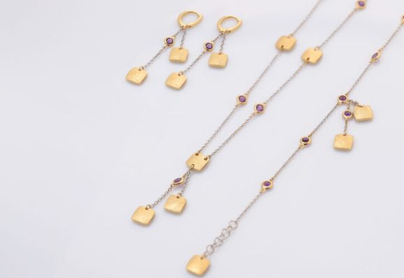 A full set of 18 carat yellow and white gold, consisting of a chain, bracelet and earring from the Laurencia collection, in three golden square shapes, and decorated in purple with semi-precious amethyst stones.