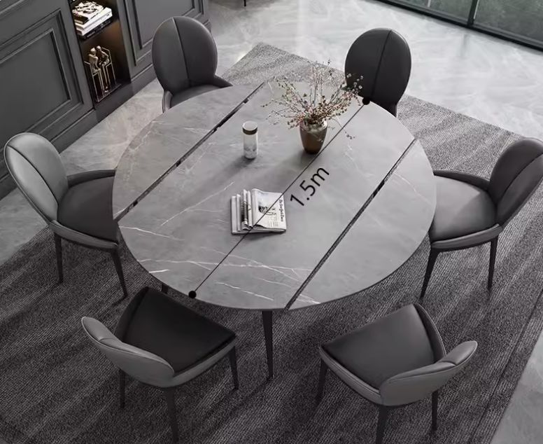 Dining table with chairs, Italian dining table, modern and modern, imported slate countertop surface , stone derived from natural kaolin stone, high hardness, acid resistance, structure of carbon steel, corrosion resistance, higher hardness, strong, durable and stable, with a retractable design Retractable chair modern design made of triple-resistant nano technology fabric , high elastic sponge, carbon steel base,