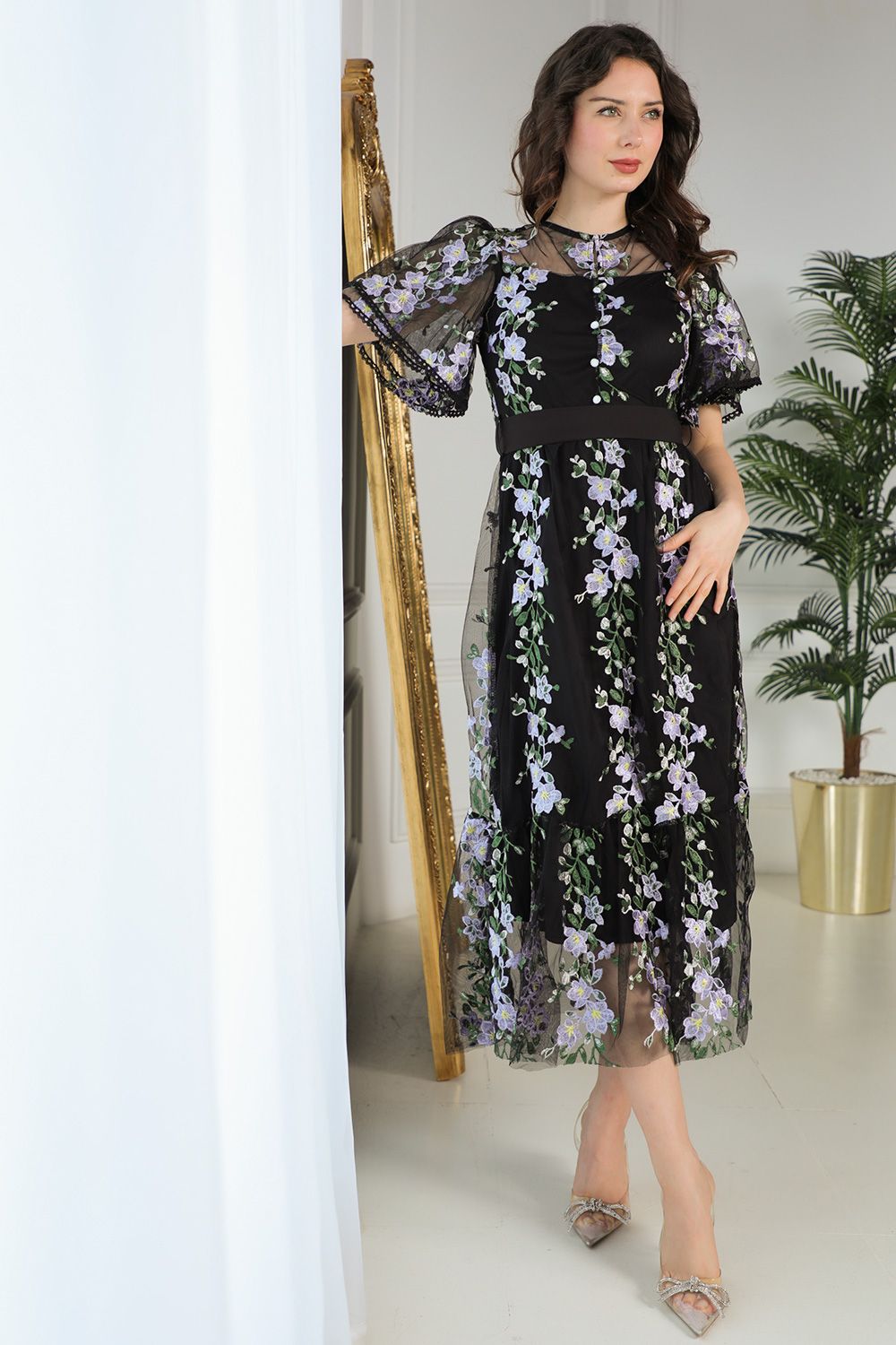 height 167 cm product specification Design type Floral tulle midi dress with belt at the waist Story type Midi waist with ruffles at the bottom, a round neck, short puff sleeves and a belt at the waist Material Tulle Occasion Public outings, parties or special occasions