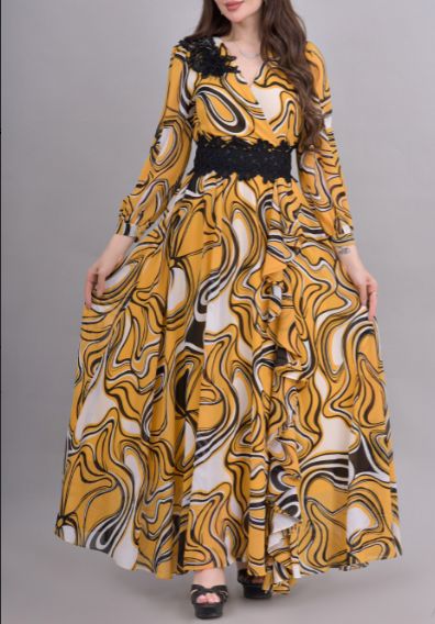الارتفاع 170 سم مواصفات المنتج نوع التصميم: فستان مموج مع حزام من الدانتيل نوع القصة طويل بقصّة كلوش وياقة V وأكمام طويلة مزينة بالريش والزهور على الكتف مع حزام من الدانتيل المادة: بوليستر المناسبة: النزهات العامة أو الحفلات أو المناسبات الخاصة الخصر زم كلوش طوق ضد الأكمام طويلة تمتد غير قابلة للتمدد حزام الإضافات تعليمات العناية تُغسل وتُكوى بالبخار عند درجة حرارة منخفضة 40% وتُعلق لتجف