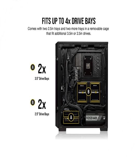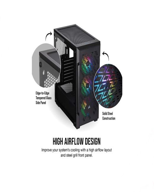 Item Code : WAGAME402 Corsair iCUE 220T RGB Airflow Tempered Glass Mid-Tower Smart Case – Black improve your system’s cooling with a high airflow layout complete with a steel grill front panel for optimal air intake Light up your PC with three included Corsair SP120 RGB Pro fans each lined with eight individually addressable LEDs around the hub (24 total) The included Lighting Node core controls your RGB lighting making for brilliant lighting effects right out of the box with Corsair iCUE software The 220T RGB airflow’s solid steel construction and front plate ensure sturdy and resilient durability along with a striking look An edge-to-edge tempered glass side panel window showcases your PC’s components and RGB lighting. Compatible corsair liquid coolers-H55, H60, H75, H80i, H90, H100i, H105, H110i, H115i, H150i