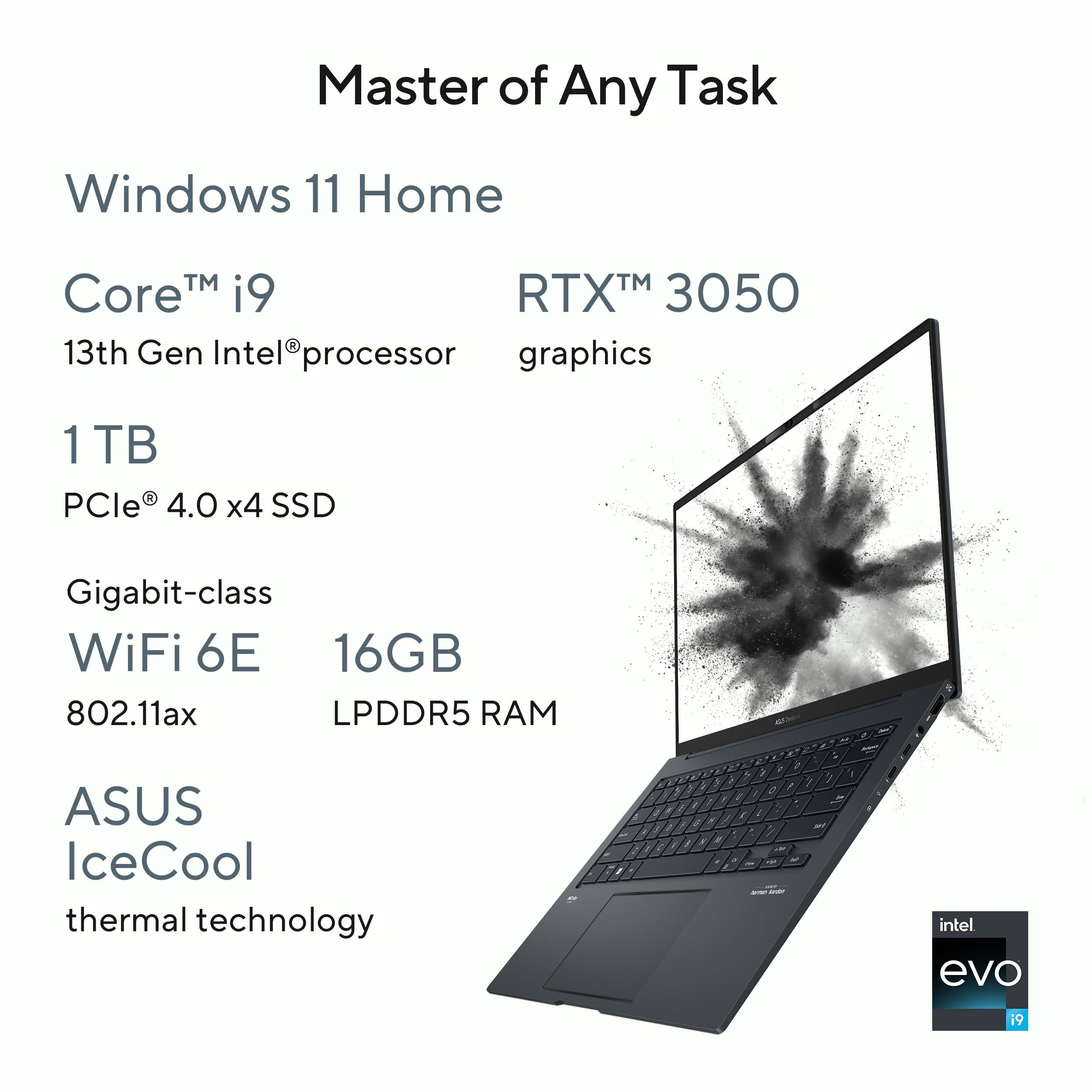 Windows 11 Home - توصي ASUS باستخدام Windows 11 Pro للأعمال كمبيوتر محمول معتمد من Intel® Evo™ معالج Intel® Core™ i9 من الجيل الثالث عشر نفيديا® جي فورس® آر تي إكس 3050 شاشة OLED HDR مقاس 14.5 بوصة 120 هرتز 2.8K ذاكرة 16 جيجابايت 1 تيرابايت اس اس دي نحيف وخفيف: 1.5 كجم، 16.9 ملم