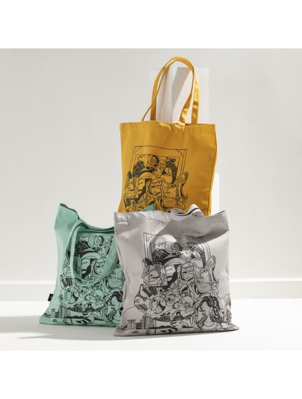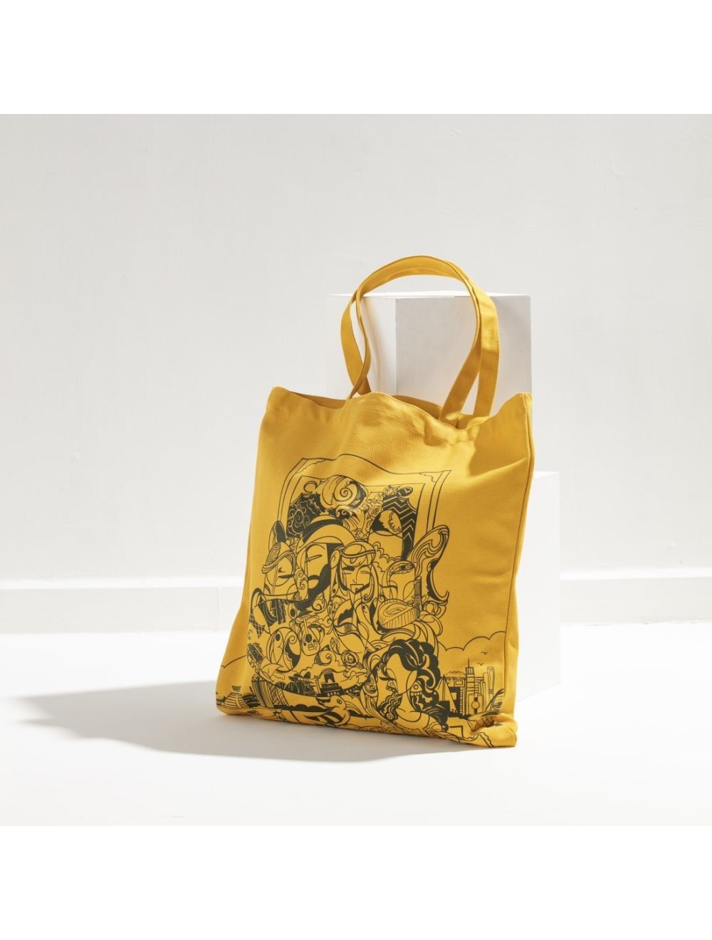 A stylish mustard canvas tote bag from Boo Design Studio featuring a beautiful illustration of a Qatari family by local artist Abdulaziz Yousef. Perfect for shopping, travelling, or everyday use, this tote bag is made of high-quality canvas material to ensure durability and longevity. The design is a unique expression of Qatari art and culture, making it a wonderful addition to any collection. A product of Boo Design Studio Weight: 150 g Size: 49 cm x 45 cm Material: Canvas