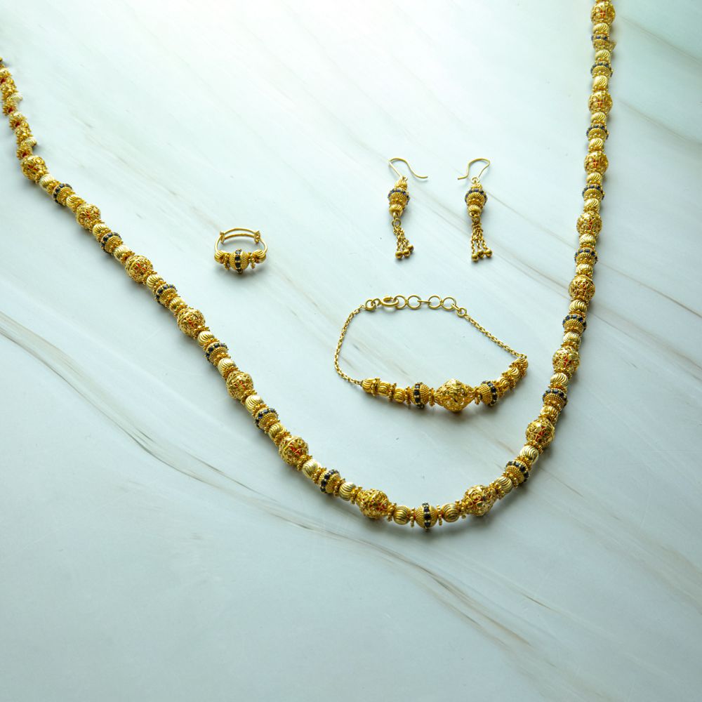 طقم فضة جميل مطلي بالذهب . تتضمن هذه المجموعة عقدًا وسوارًا وخاتمًا وزوجًا من الأقراط.