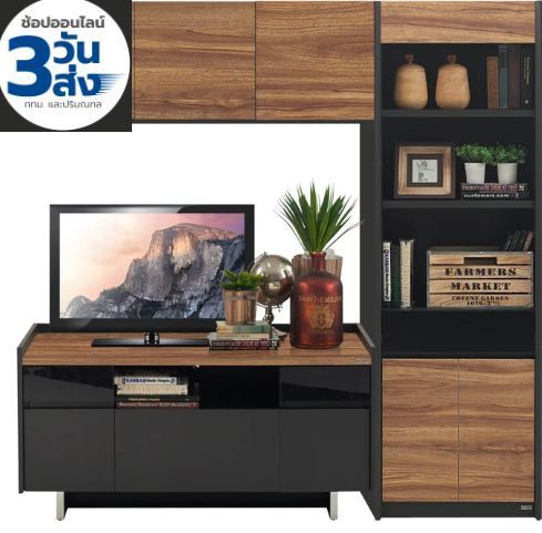 Home Entertainment Set Raffs & Pergo, Contemporary Style Autumn brown color, cut black gray, size 180 x 55x 185 cm. (suitable height) adds outstanding aesthetic charm with natural wood pattern, cut black gray, revealing elegance in contemporary style. Comes with a handle-less hanging box, Push to Open system, convenient to use