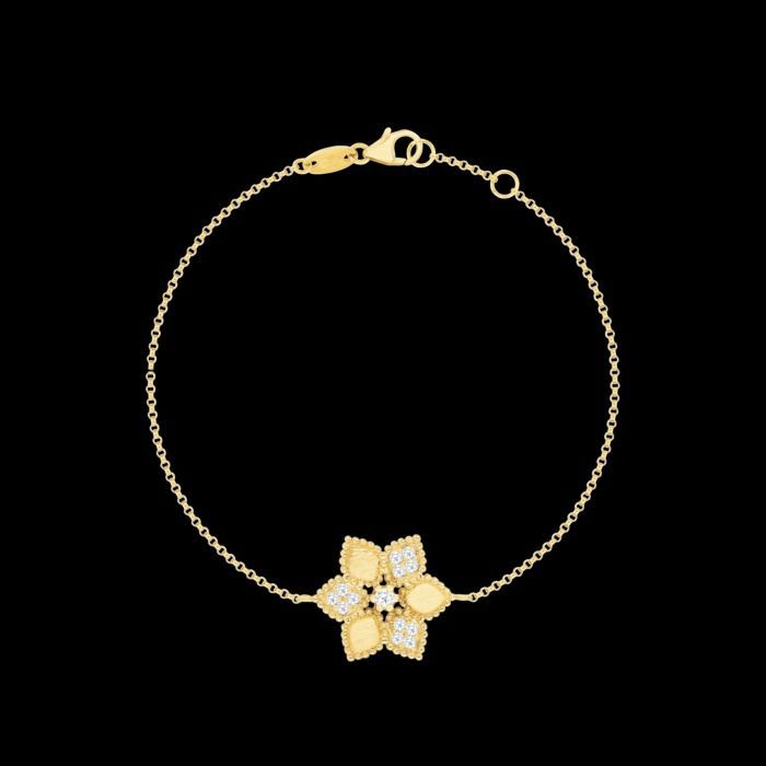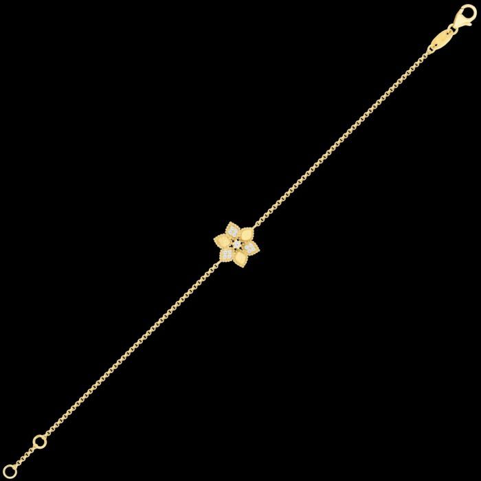 Stella D'Oro 18K Yellow Gold Diamond Bracelet This Stella d'Oro 18k yellow gold and 0.10 carat diamond bracelet is a true testament to every woman’s eternal beauty. The alluring six-petalled flower motif takes centre stage, with three o...