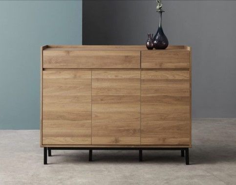 Sideboard 120cm, model SI-1295 from Inhome Furniture. It's a sideboard that's suitable for a medium-sized house or condo because it's not very wide. But can put a lot of things There are 6 storage compartments below, including 3 soft-close doors and 2 drawers, commonly used for storing things in the living room. or dining room, can put plates, bowls, cutlery, various cleaning cloths Make the house look neat and tidy. The sideboard is made from particle board. Cover with extra thick foil imported from abroad. and 6 black steel legs, goes well with a modern style house or condo as knock-down furniture. Can be disassembled