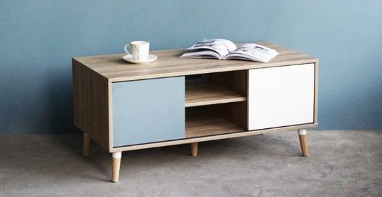 Stuttgart center table 100cm, solid oak-blue-white-gray, model CT-1046-SBWG Stuttgart center table 100cm, solid oak-blue-white-gray, model CT-1046-SBWG from Inhome Furniture is a center table. Suitable for a home or condo. modern style With light colored rubberwood legs And the front is blue, white, and gray. The center table is made of particle board. Covered with melamine surface all over, making it possible to place both hot and cold drinking glasses. Or if you spill water and use a cloth to wipe it off, it won't cause the wood to swell. There are also shelves and books. Located at the bottom to increase usable space. This center table is a knock-down furniture. Can be disassembled