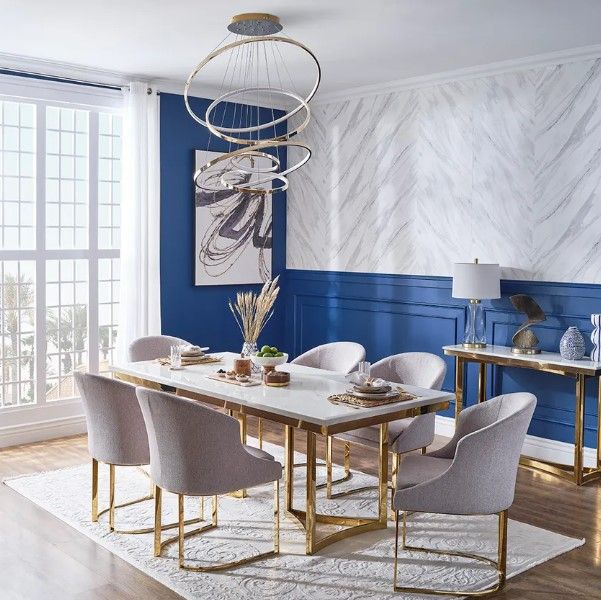 Bring a touch of sparkle and sophistication to your contemporary space with the Noto dining table. This sturdy table has a thick white faux marble top and a glossy gold metal base, making it a stunning addition to any dining area. Gather eight chairs around it and you'll be ready to host a luxurious dinner for your family and friends. The product images have props used for illustrative purposes. The product is one Noto Dining Table. Dining chairs are sold separately.