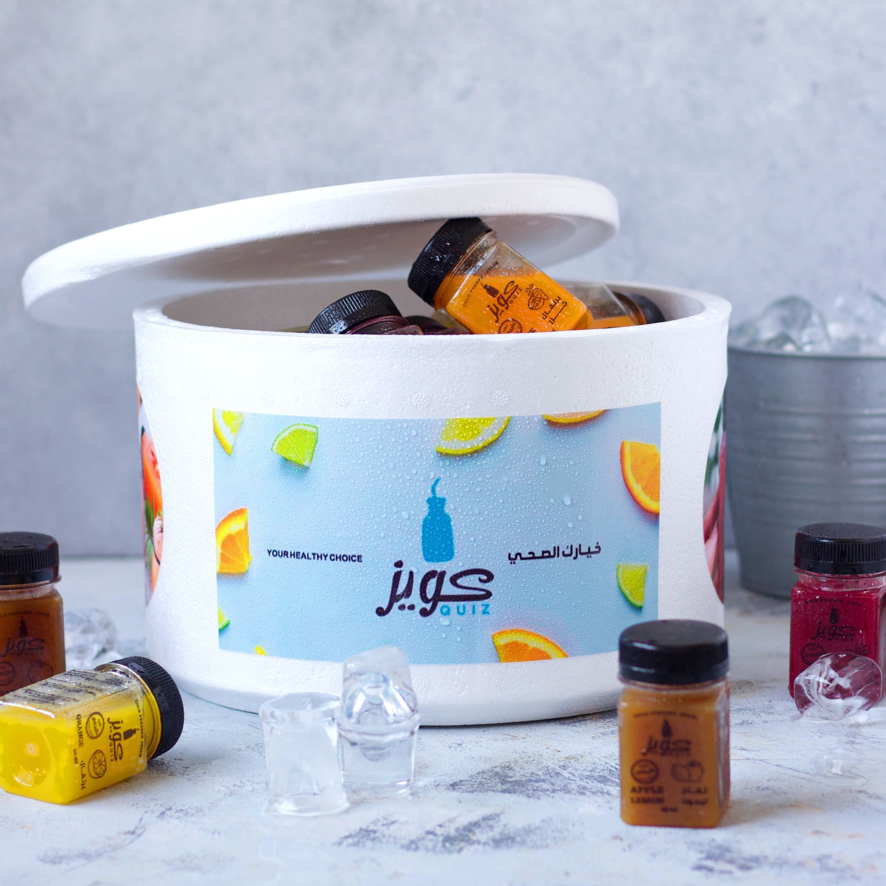 20 60 ml packages. Mix: 6 oranges, 6 beets/oranges, 4 carrots/oranges, 2 apples, 2 lemons/apples, box + ice.