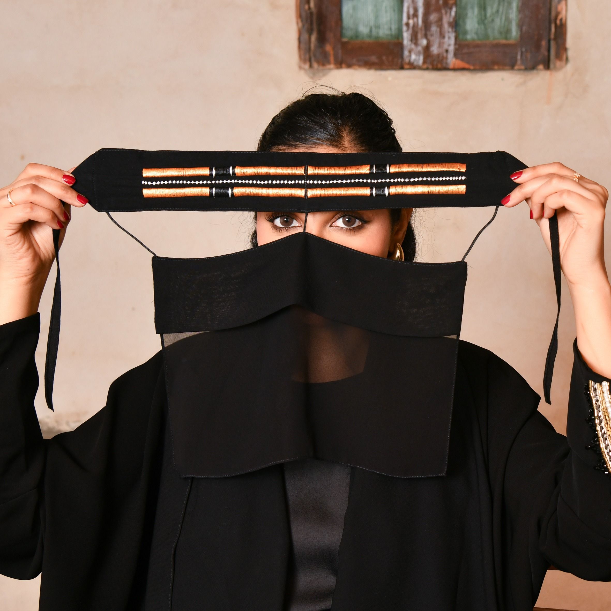A two-layer black burqa decorated with shiny gold and silver threads, inspired by the qasab headband