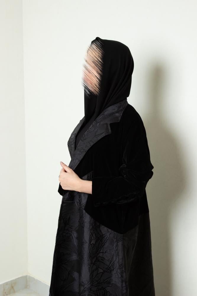 Practical velvet cloche abaya with overlays of floral jacquard fabric and lining with buttons of velvet fabric to give you a wonderful and streamlined look