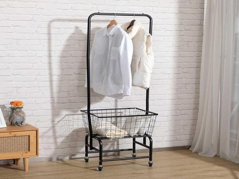 Dimensions: 168 cm * 56 cm. Colors: 2 colors (white and black) Shape: It consists of a hanger to carry clothes and a storage basket with 4 wheels for easy moving from place to place. Materials: strong metal structure and steel mesh. Features: It has a durable, painted metal body. Space saving, as it can be placed in the corner of the room. Multi-functional design. It has 4 wheels for easy moving of the stand, and two of them can be locked when needed for stability.