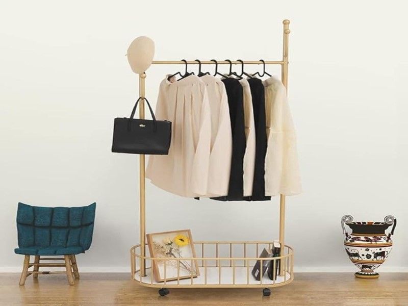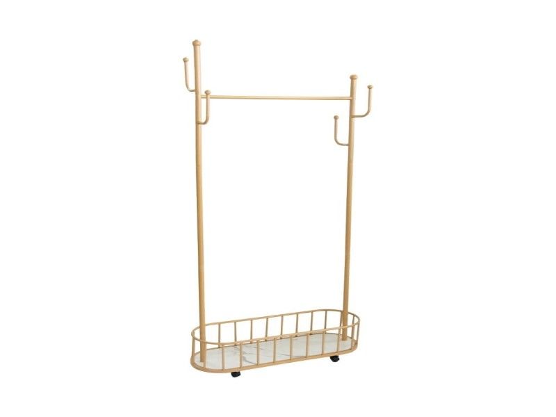 Clothes hanger with golden stand and storage basket, mobile. Dimensions: 30*75*170 cm Modern design clothes hanging stand with moving wheels. It is used in the corners of the house to hang clothes, bags, and hats in an organized manner. An ideal storage basket for storing items with a marble base. Suitable for home entrances, bedrooms, offices, and living rooms. It saves space. Mobile, easy to move to any corner of the house.