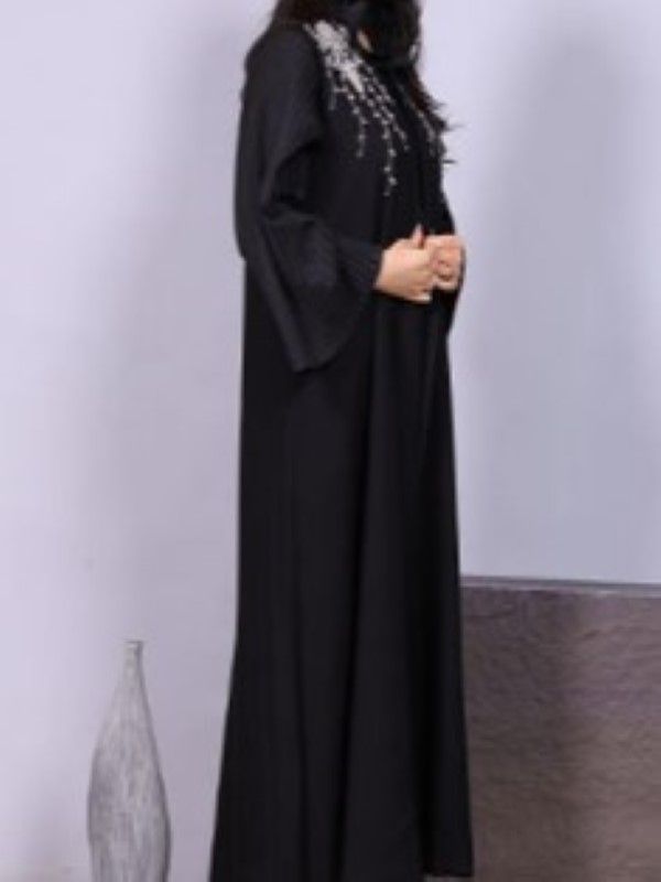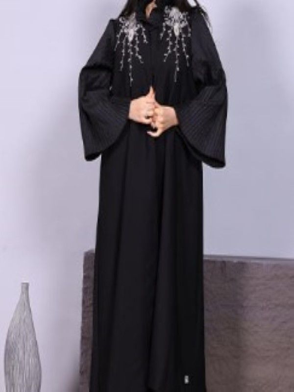 A women's crepe bisht with a high collar, decorated with a silver handmade ruffle, and wide plastered sleeves, in black