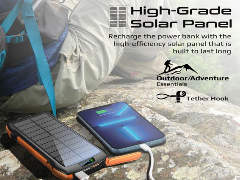 1- The power of the power bank is 10 thousand mAh 2- It can be recharged by the sun or with a Type C charging cable 3- It has three USB ports, a BD port and a Type C port 4- Shock and water resistant 5- It has a wireless charging system 6- It has a powerful searchlight for trips