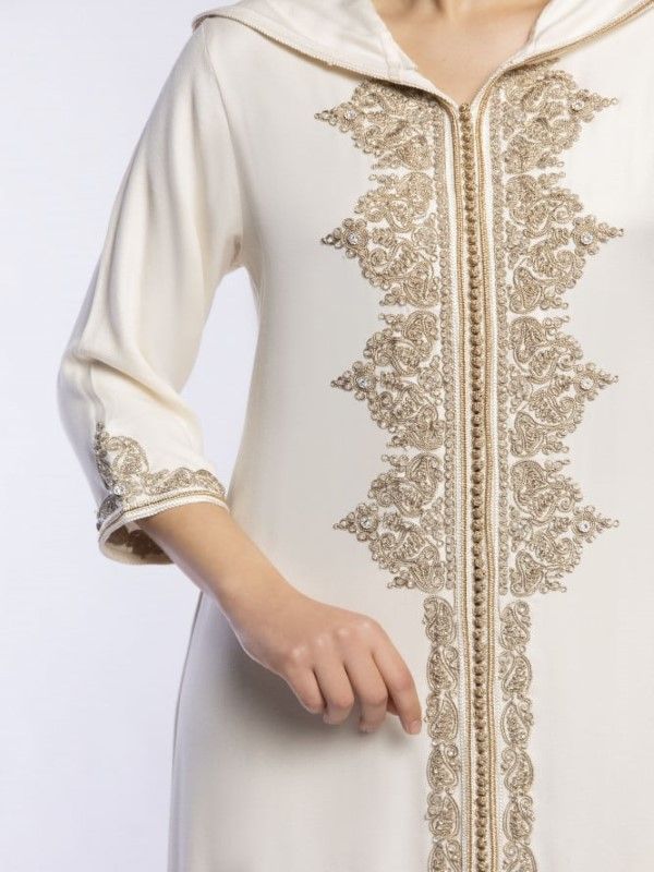 Kaftan for charming elegance that attracts the attention of those around you. We chose for you, Madam, an emerald kaftan. Emerald design details: · A flowy cotton kaftan embroidered with luxurious bronze threads and studded with emeralds · Color: We carefully chose the color for a distinctive look (light sugar color) · Made by a group of skilled craftsmen