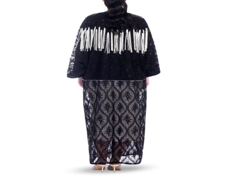 Color: Black V-neckline Beands on the shoulder Tassel on front and all over sequince embellished abaya Including scarf/sheila Fully lined Dry clean only Model Height is 179 cm. Product Code 21200094