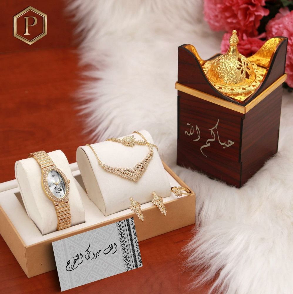 The set consists of: (a high-end watch - a ring - a distinctive necklace - an earring - a zipper bracelet - a wooden incense burner - a luxurious set box - a cardboard gift bag).