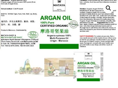 Argan oil is a rich source of natural ingredients that is good for the skin, nail and hair care. This oil has Vitamin E, carotenoids, polyphenols and Squalene to support antioxidants and anti-aging properties that prevent wrinkles, guard against drying, loss of elasticity and enhance the skins natural moisture, as well as protect skins from cancer. Its antiseptic and bactericide properties protects skin from infections that is suitable to cure acne and scar, also scalp and hair problem. Our Argan oil is certified organic by USDA.