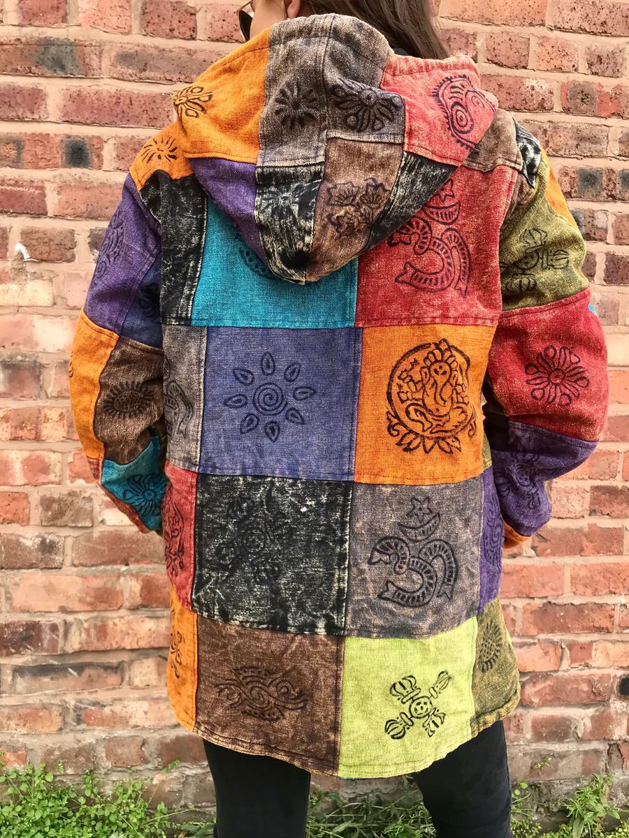 Authentic product of Nepal 100% cotton material Unisex Jacket Available in 3 sizes Patch work design Fleece lining inside of the jacket 2 side pockets Hood with adjustable strings Metal zip fasten Machine washable