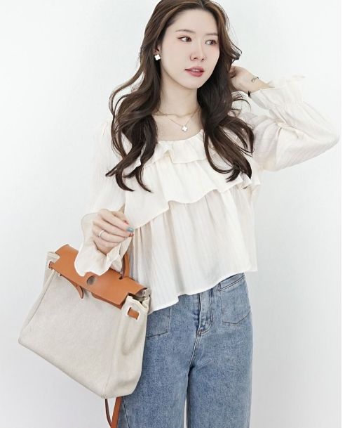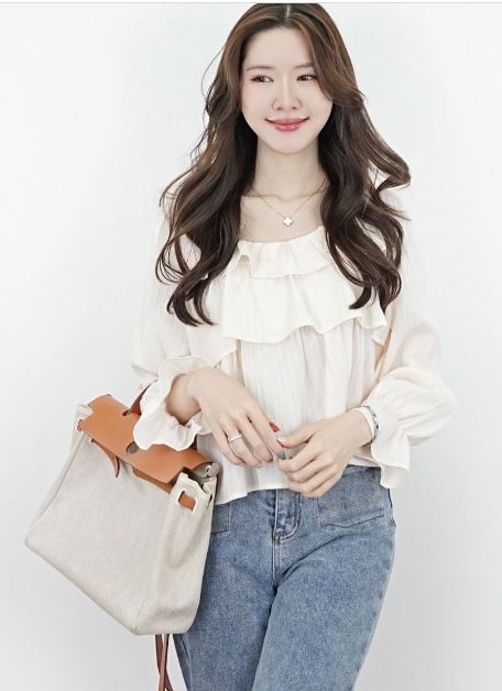Long-sleeved blouse with ruffles. Fabric: Chiffon fabric with texture, lightweight, drape Style: Slightly loose fit with cuffs