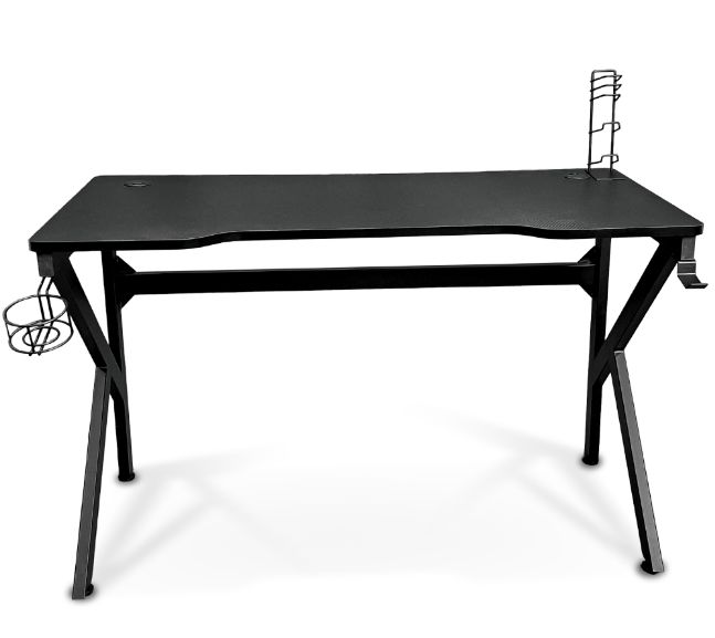 The table top surface is carbon fiber. Table top size: 120x60cm Table height : 74cm Can support weight 60kg steel leg structure Include cup holder, joystick holder, headphone holder